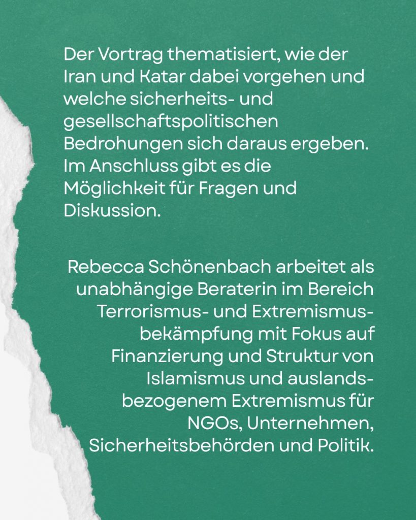 Der Vortrag thematisiert, wie der Iran und Katar dabei vorgehen und welche sicherheits- und gesellschaftspolitischen Bedrohungen sich daraus ergeben. Im Anschluss gibt es die Möglichkeit für Fragen und Diskussion.
