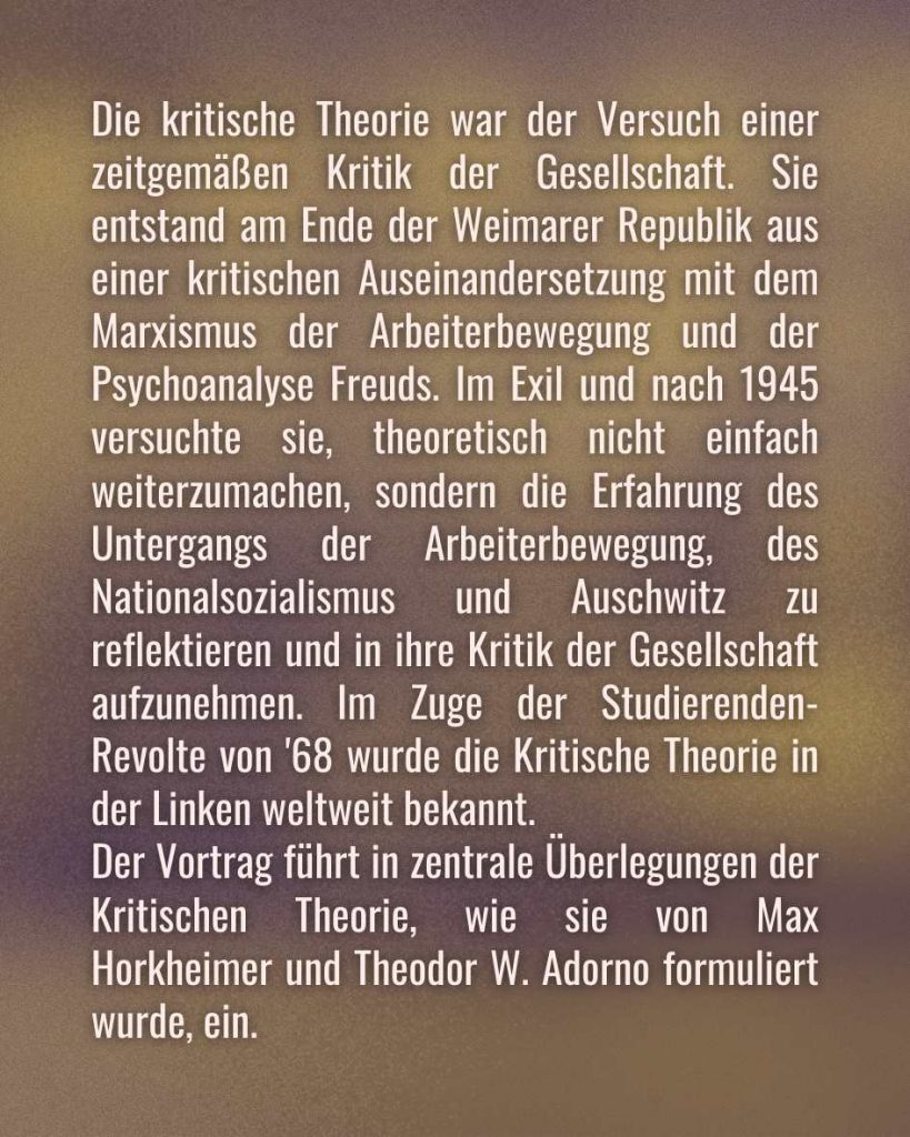 Die kritische Theorie war der Versuch einer zeitgemäßen Kritik der Gesellschaft. Sie entstand am Ende der Weimarer Republik aus einer kritischen Auseinandersetzung mit dem Marxismus der Arbeiterbewegung und der Psychoanalyse Freuds. Im Exil und nach 1945 versuchte sie, theoretisch nicht einfach weiterzumachen, sondern die Erfahrung des Untergangs der Arbeiterbewegung, des Nationalsozialismus und Auschwitz zu reflektieren und in ihre Kritik der Gesellschaft aufzunehmen. Im Zuge der Studierenden-Revolte von ’68 wurde die Kritische Theorie in der Linken weltweit bekannt. Der Vortrag führt in zentrale Überlegungen der Kritischen Theorie, wie sie von Max Horkheimer und Theodor W. Adorno formuliert wurde, ein.