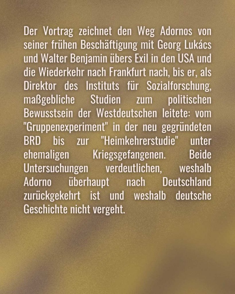 Der Vortrag zeichnet den Weg Adornos von seiner frühen Beschäftigung mit Georg Lukács und Walter Benjamin übers Exil in den USA und die Wiederkehr nach Frankfurt nach, bis er, als Direktor des Instituts für Sozialforschung, maßgebliche Studien zum politischen Bewusstsein der Westdeutschen leitete: vom „Gruppenexperiment“ in der neu gegründeten BRD bis zur „Heimkehrerstudie“ unter ehemaligen Kriegsgefangenen. Beide Untersuchungen verdeutlichen, weshalb Adorno überhaupt nach Deutschland zurückgekehrt ist und weshalb deutsche Geschichte nicht vergeht.
