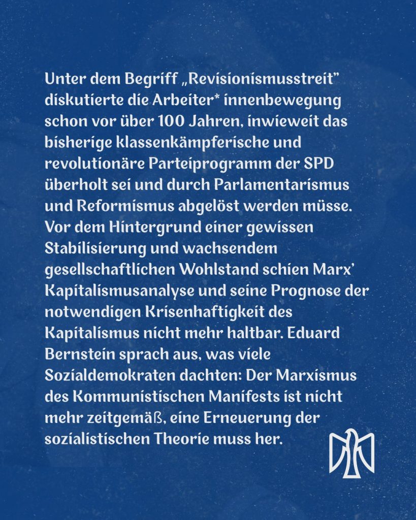 Unter dem Begriff „Revisionismusstreit“ diskutierte die Arbeiter* innenbewegung schon vor über 100 Jahren, inwieweit das bisherige klassenkämpferische und revolutionäre Parteiprogramm der SPD überholt sei und durch Parlamentarismus und Reformismus abgelöst werden müsse. Vor dem Hintergrund einer gewissen Stabilisierung und wachsendem gesellschaftlichen Wohlstand schien Marx‘ Kapitalismusanalyse und seine Prognose der notwendigen Krisenhaftigkeit des Kapitalismus nicht mehr haltbar. Eduard Bernstein sprach aus, was viele Sozialdemokraten dachten: Der Marxismus des Kommunistischen Manifests ist nicht mehr zeitgemäß, eine Erneuerung der sozialistischen Theorie muss her.