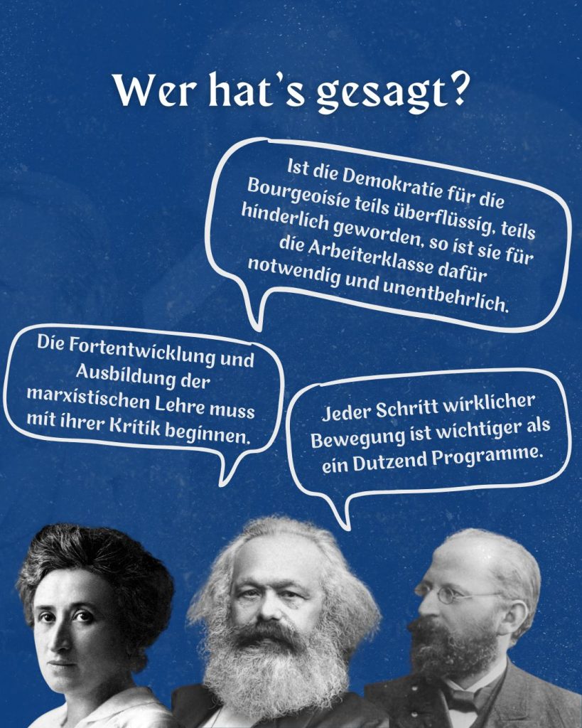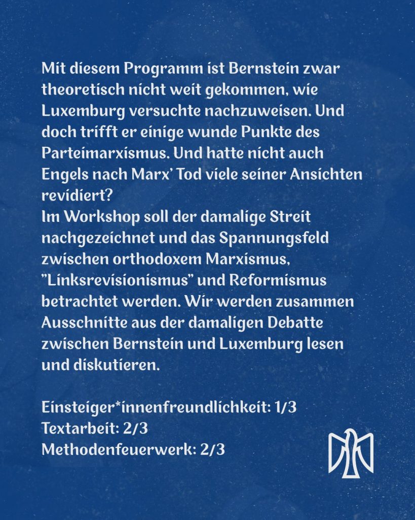 Im Workshop soll der damalige Streit nachgezeichnet und das Spannungsfeld zwischen orthodoxem Marxismus, “Linksrevisionismus“ und Reformismus betrachtet werden. Wir werden zusammen Ausschnitte aus der damaligen Debatte zwischen Bernstein und Luxemburg lesen und diskutieren.